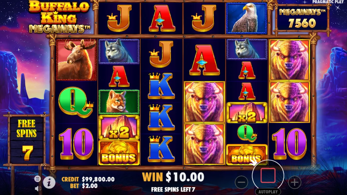 Buffalo King Megaways de Pragmatic Play es una tragamonedas de video de 6 carretes y 2 a 8 filas. El concepto Megaways del juego, que permite un número aleatorio de filas por tirada, también es responsable de la aleatoriedad del número de líneas de pago que aparece en los carretes después de cada tirada. La apuesta mínima es de 0,20 y la máxima de 125. En su juego base, Buffalo King Megaways tiene un porcentaje de retorno al jugador (RTP) del 96,52%; con la opción Bonus Buy activada, el RTP baja al 96,50%. Tiene un gran potencial de pago de hasta 5.000 veces la apuesta para un jugador afortunado.